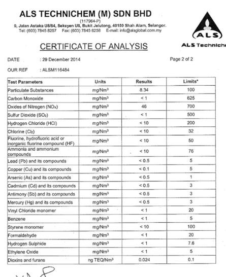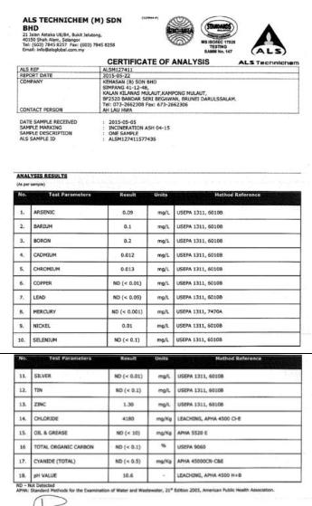 Kehasan monitors its treated effluent, exhaust air emission and treated solids or ashes. US TCLP tests are carried out to ensure compliance of landfill criteria for treated solids for landfill. All laboratory analysis are carried out independent third party. These results are compiled and submitted to the Department of Environment Parks and Recreation on quarterly basis pursuant to Chapter 7 of the Guidelines. Typical types of results submitted are shown below.
